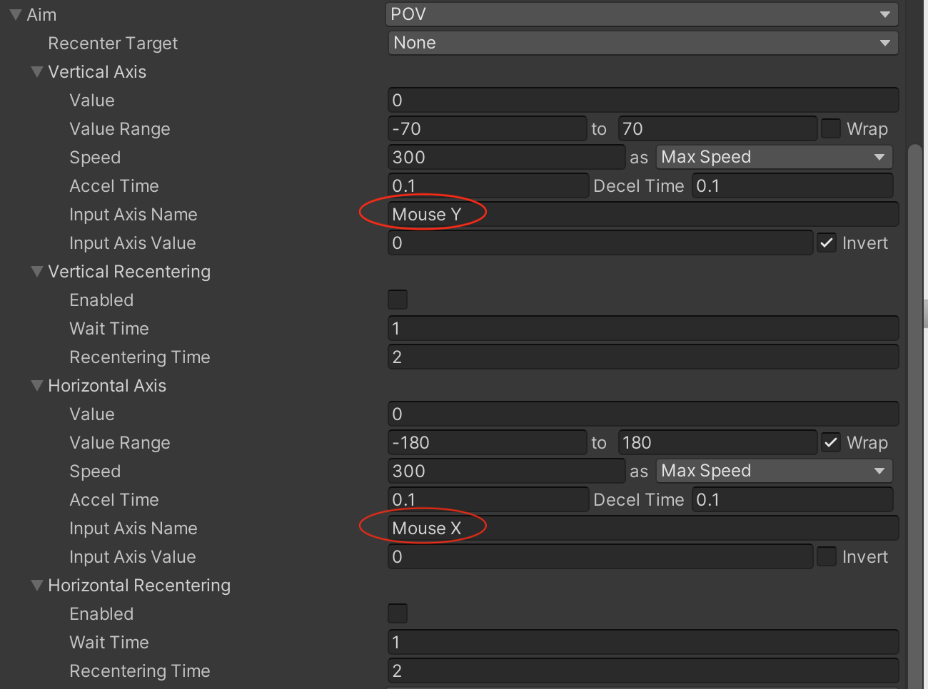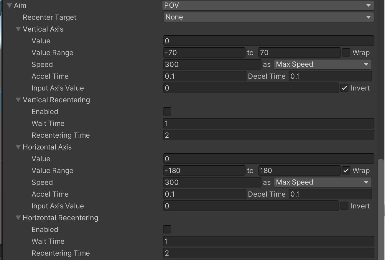 当我们为Aim 选择POV 模式的时候,确实下面的Vertical Axis -> Input Axis Name、Horizontal Axis -> Input Axis Name 的值是基于Input Manager(Old)的
