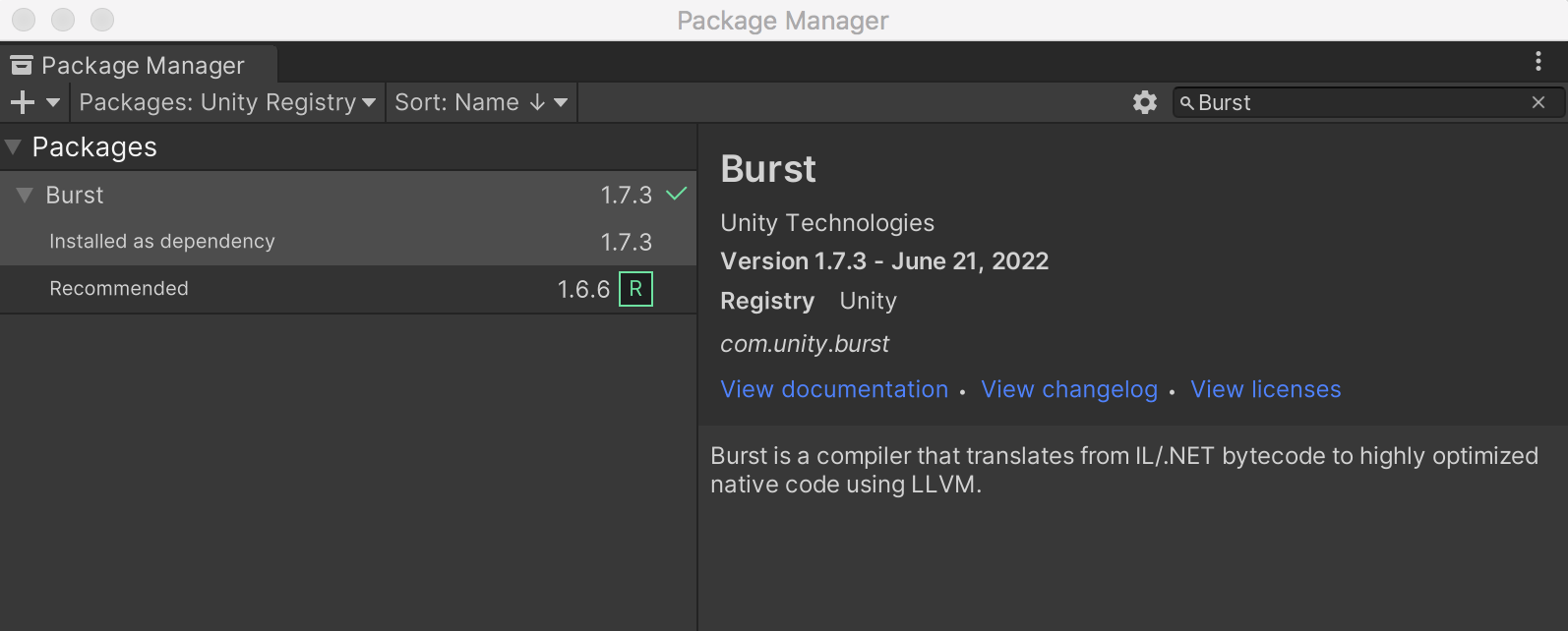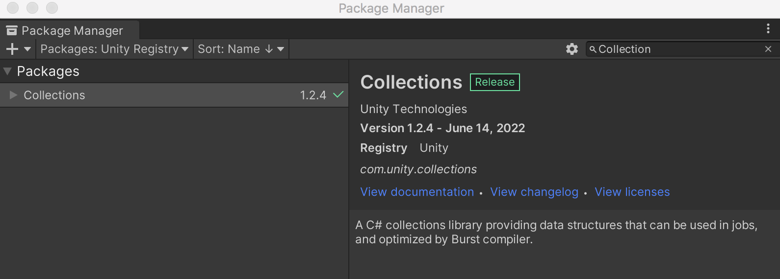 Magica Cloth 是基于Unity Job System 和Burst 编译器进行快速布料模拟,所以需要在Package Manager 中安装两个基础的包:Burst、Jobs(Jobs 从2021 之后改名为Collection 了)