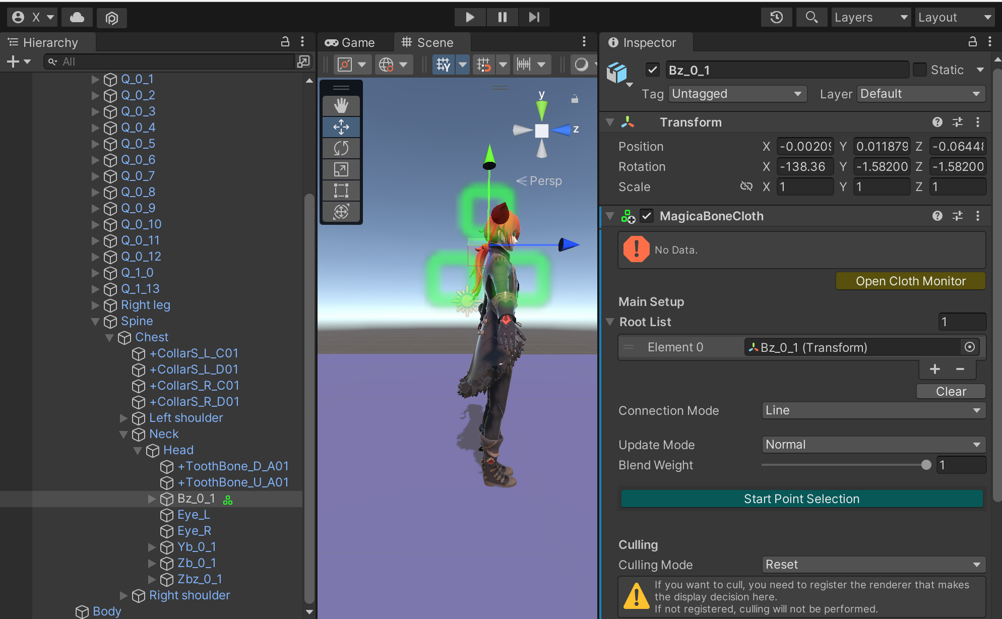 首先找到衣服的其中一个骨骼,这里是Q_0_1,为其增加MagicaBoneCloth 组件,在Root List 中增加所有的衣服根骨骼(具体可以通过Blender 查看),这里是Q_0_1、Q_0_2、Q_0_3……