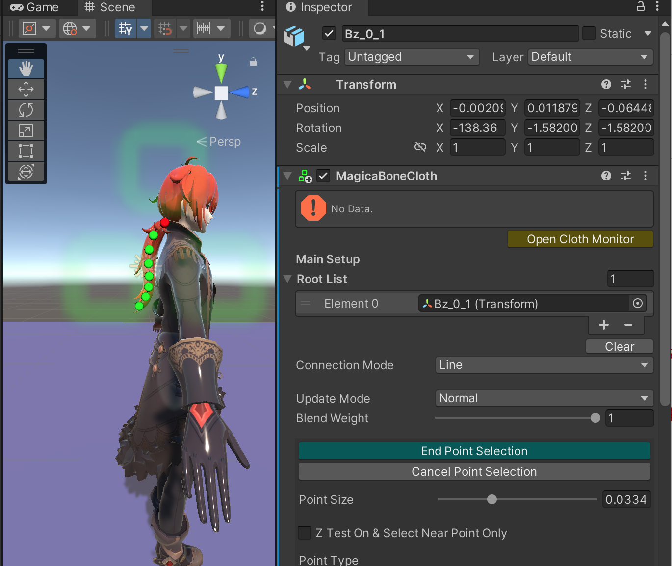先处理头发部分,找到头发对应的骨骼,对于这个模型是Bz_0_1,在这里增加一个MagicaBoneCloth 组件,效果是这样的