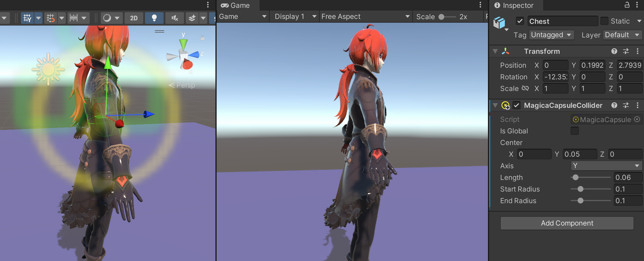 对应找到穿模所在地方的骨骼,针对我们的模型就是Chest,为其增加MagicaCapsuleCollider 组件,然后调整位置、旋转、大小,变成如下的效果