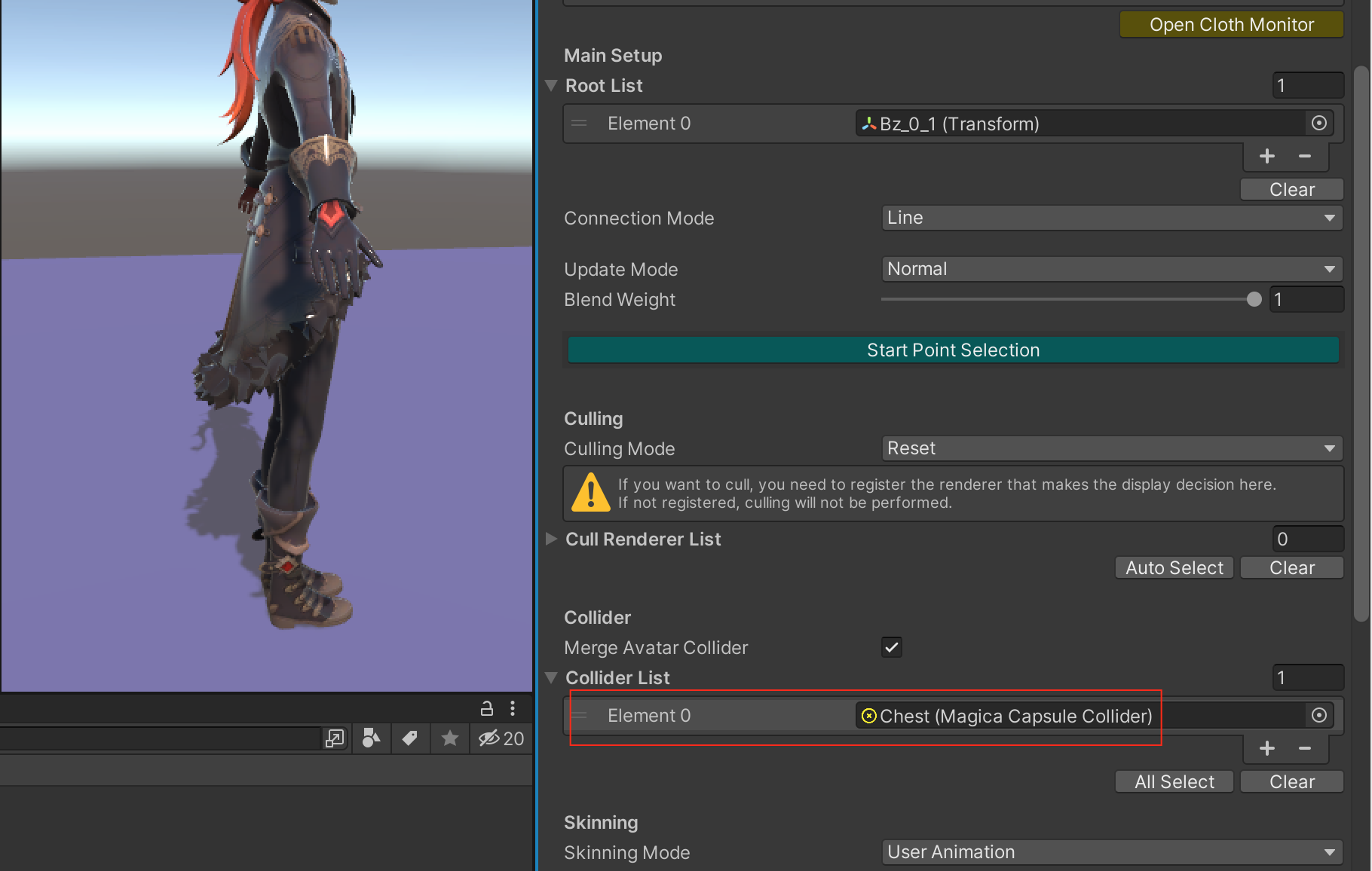 回到Bz_0_1 骨骼上找到添加的MagicaBoneCloth 组件,在其【Collider List】属性中添加刚才增加的碰撞器组件