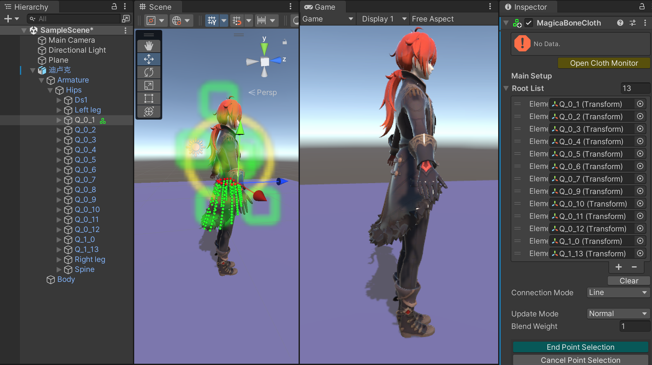 再回到Q_0_1 的MagicaBoneCloth 组件,Collider List 属性添加刚才为左右腿增加的MagicaCapsuleCollider 组件