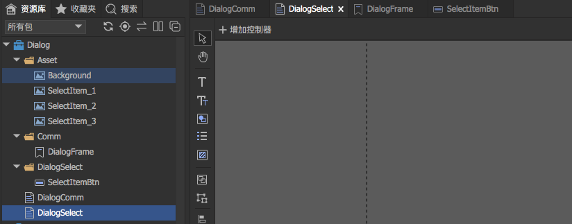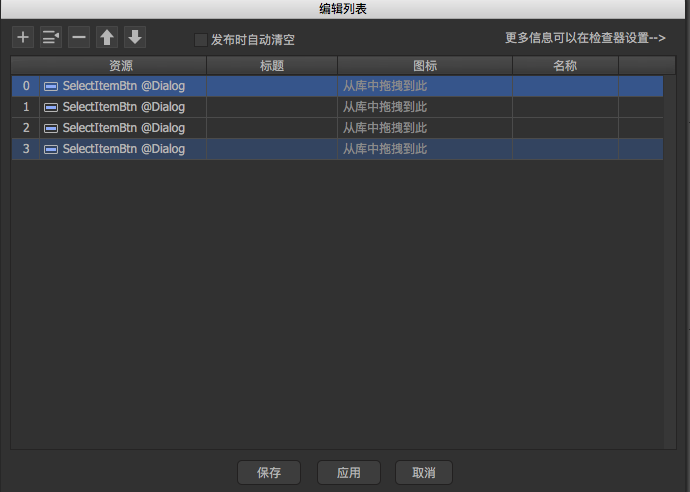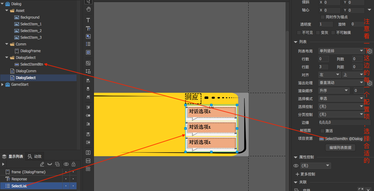SelectList 是DialogSelect 控件下的一个组件,List 的每个Item 通过【项目资源】设置,这里设置为SelectItemBtn