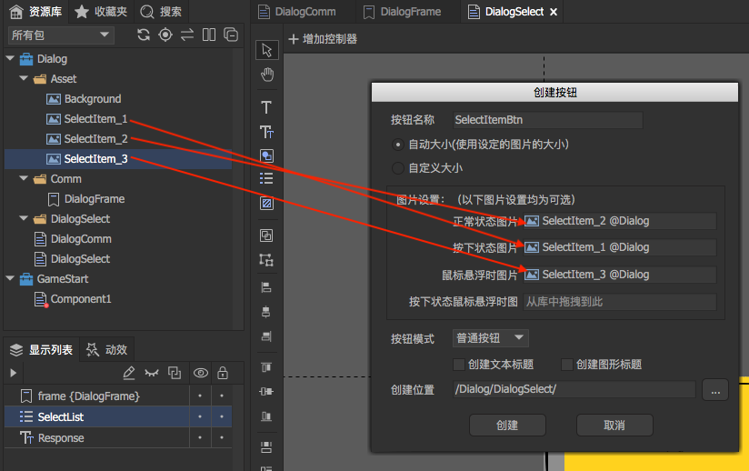 首先创建按钮的时候,如下图,设置正常状态图片、按下状态图片、鼠标悬浮时图片,使用到的图片参考前面对于素材的介绍