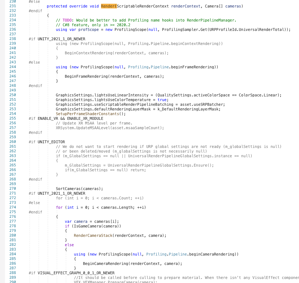 具体的入口是Universal RP/Runtime/UniversalRenderPipeline.cs 的Render() 方法