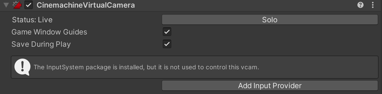 因为Orbital Transposer 是可以由玩家操作的,这里检测到了项目中安装了InputSystem,是否要添加输入的辅助组件,如果不添加的话,这个虚拟相机暂时是无法正常操作的,点击【Add Input Provider】