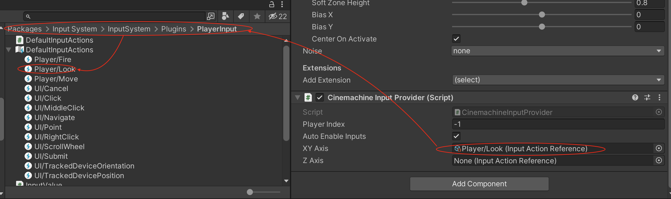 然后可以看到当前的Game Object 上面多了一个Cinemachine Input Provider 的脚本,使用Input System 自己默认带的Default Input Actions 的Look 作为控制相机行为的Action