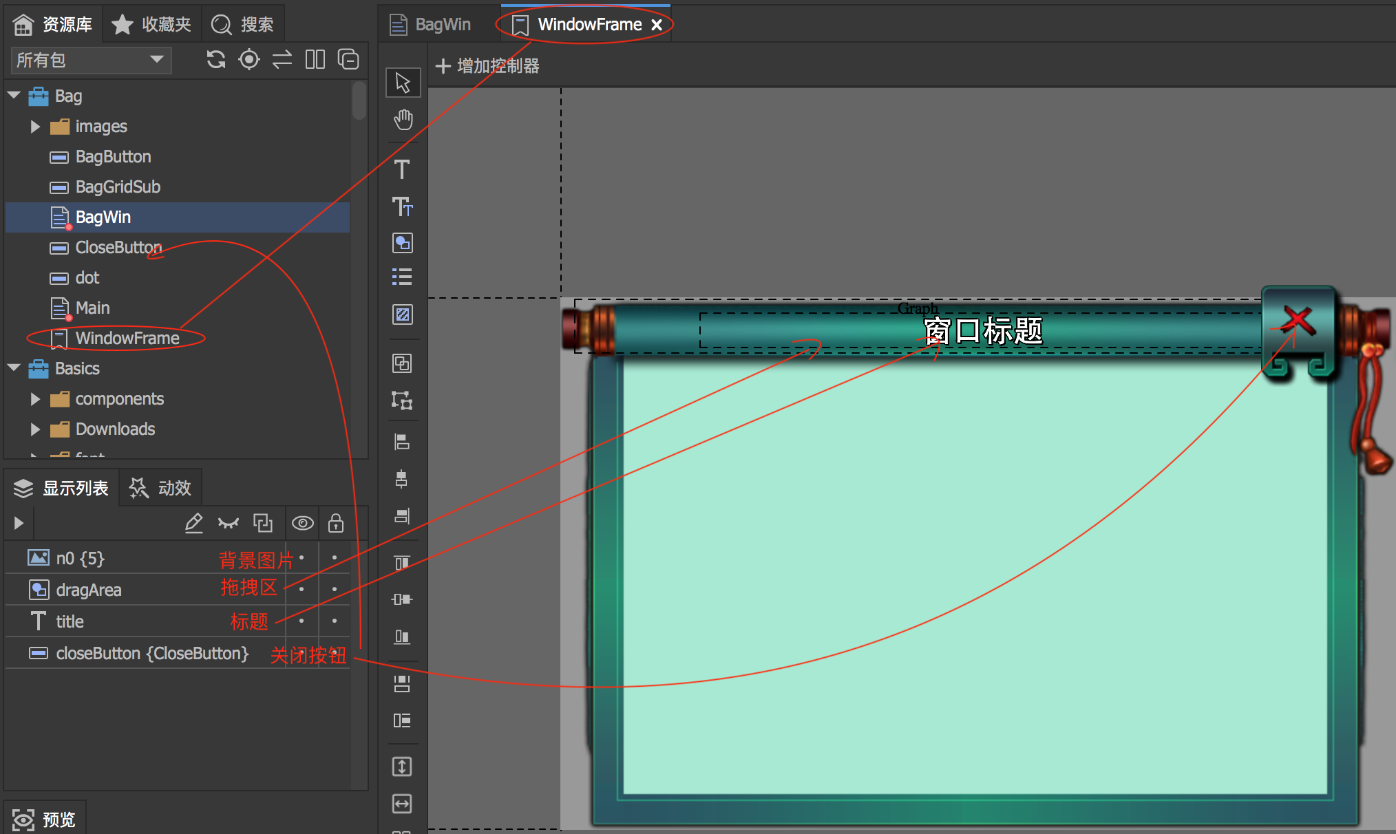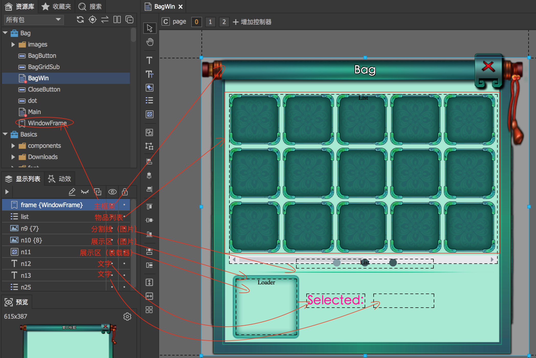 双击BagWin 中的frame,其对应Bag 包下面的WindowFrame 【标签】,其结构分析如下图所示