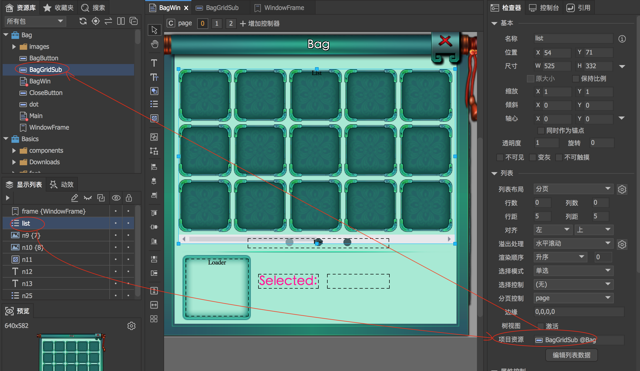 list 控件的每一项对应BagGridSub 组件,在这里设置