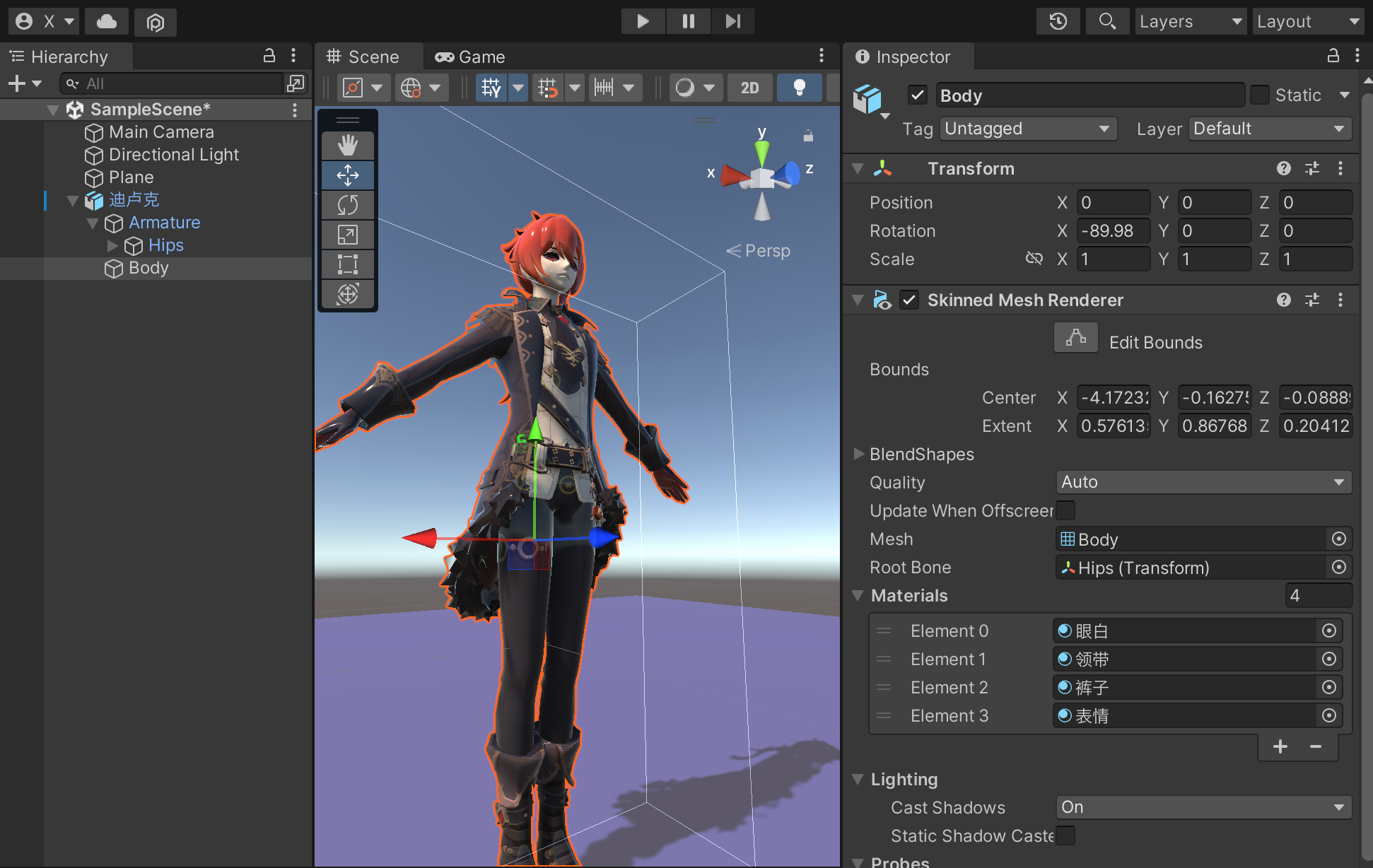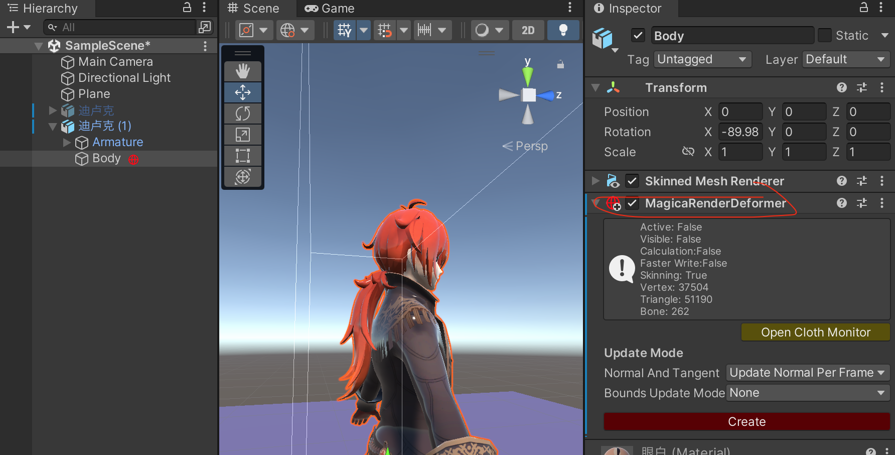 需要指明的一点就是,如果想要使用MeshCloth,也是需要对模型规范有一定要求的,比如需要对衣服做模拟,那么在模型中衣服是要有单独的Skinned Mesh Renderer 组件的