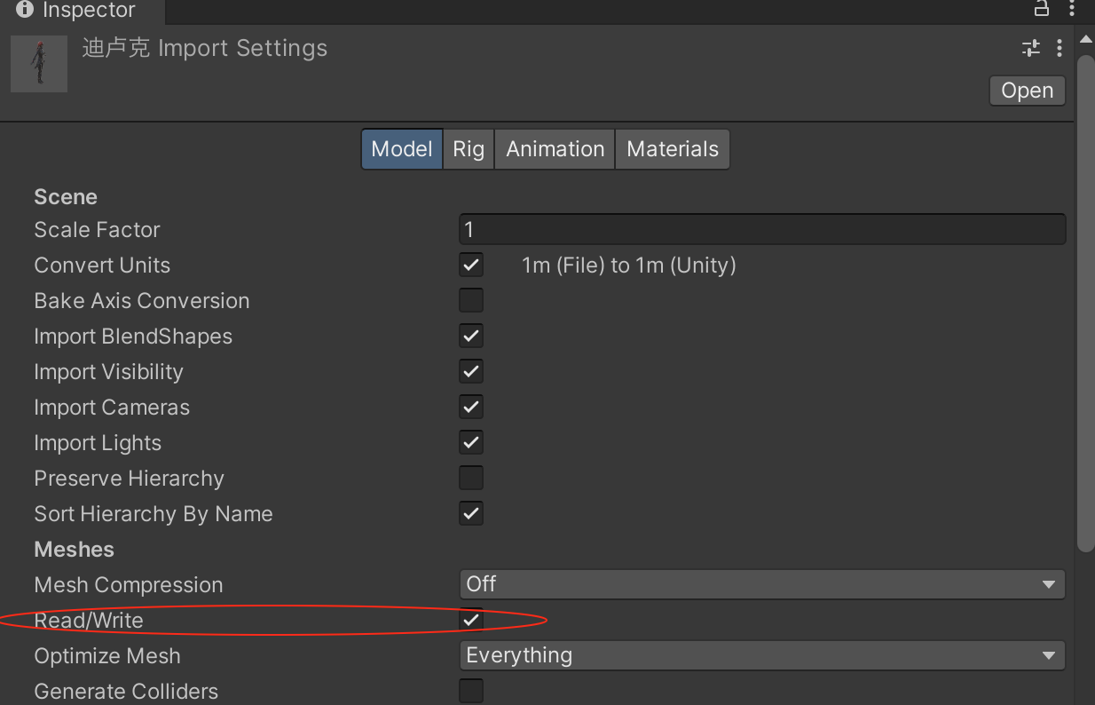 首先找到fbx 模型,修改其Read/Write,设置为Enable,这个必须要勾选,MeshCloth 才能生效