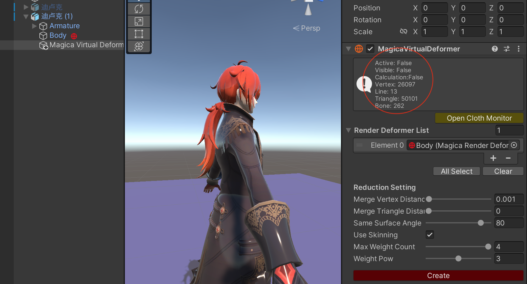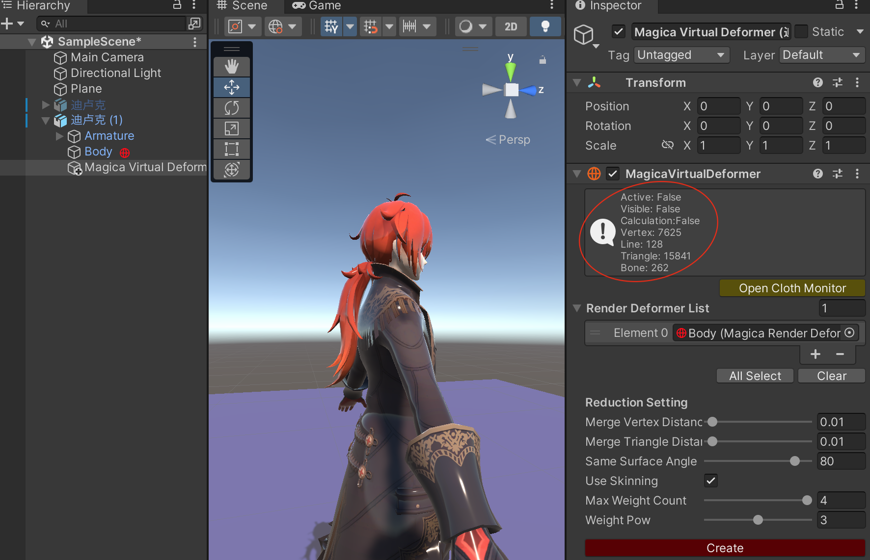 当然如果觉得顶点太多,可以回到【MagicaVirtualDeformer】中调整Merge Vertex Distance、Merge Triangle Distance,重新Create,降低顶点数