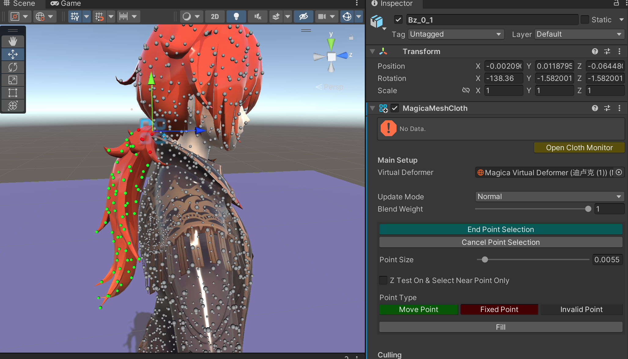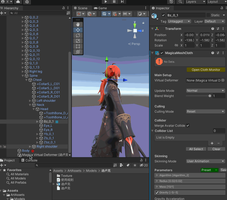 和上文使用的模型一致,找到骨骼中的Bz_0_1,为其添加【MagicaMeshCloth】组件,并且选择【Virtual Deformer】为刚才新建的游戏物体