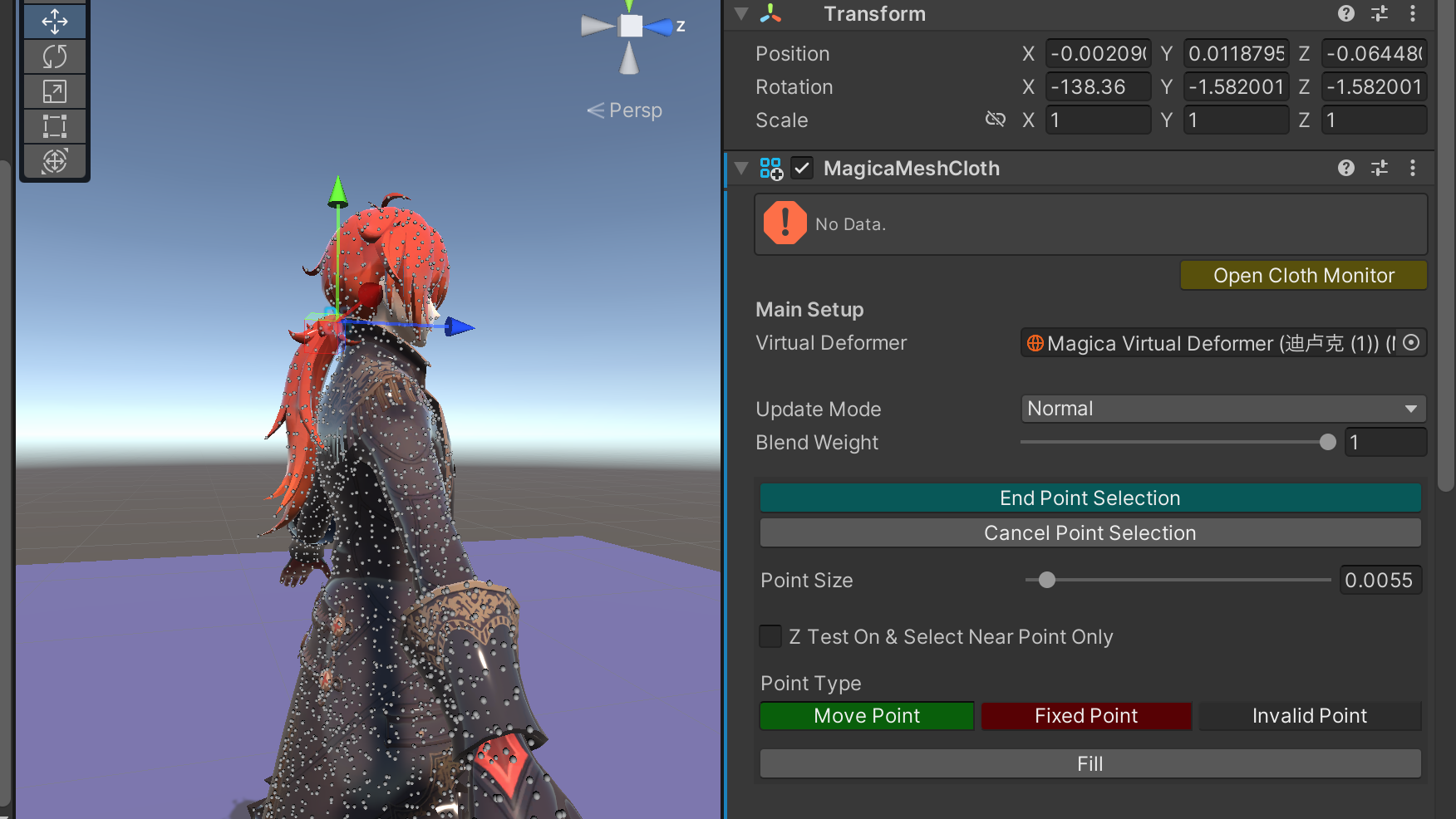 另外很明显可以看出,头发存在和模型粘连的情况,应该就是因为在上面设置顶点类型的时候没有配置好导致的,所以使用MeshCloth,如果模型没有拆分好,的确是很麻烦的事情
