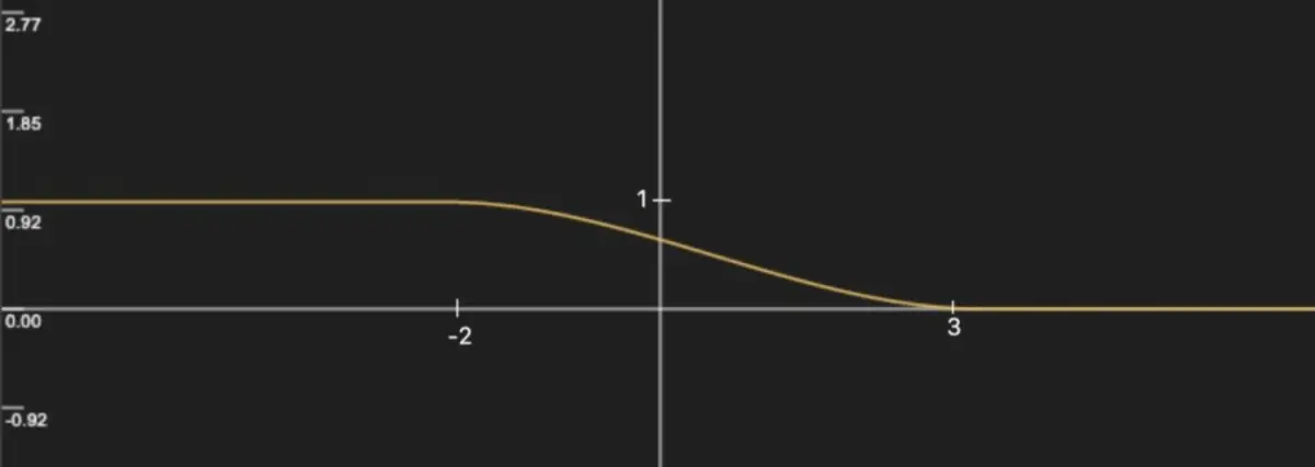 在a > b 的情况下,当x < b 时,返回1,当x > a 时,返回0,否则在1 和0 之间平滑过渡,交换上述a 和b 的位置,可以得到 smoothstep(3, -2, x) 的函数图像 :
