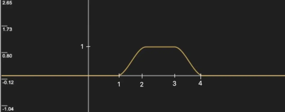 想要增加波峰的持续宽度,可以构造smoothstep(1, 2, x) - smoothstep(3, 4, x),图像如下: