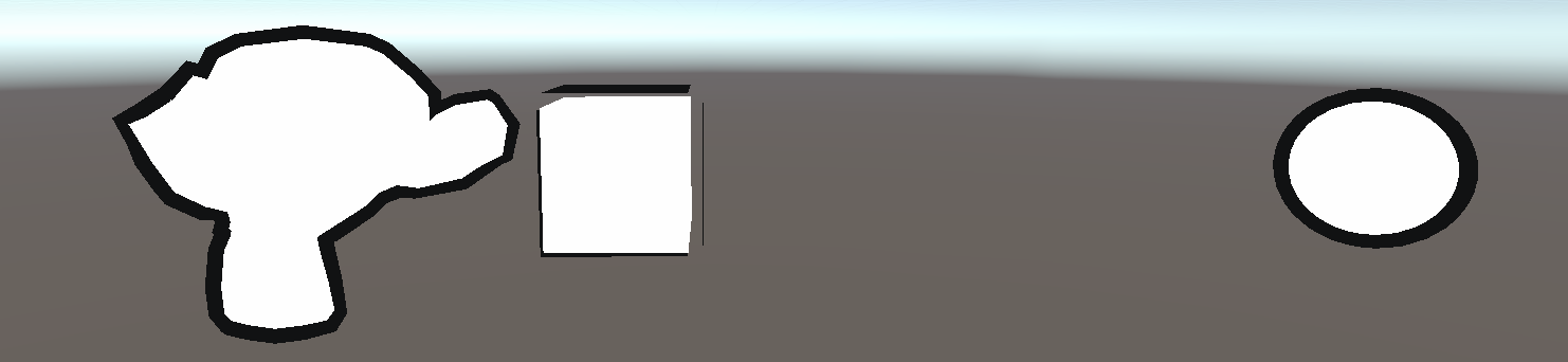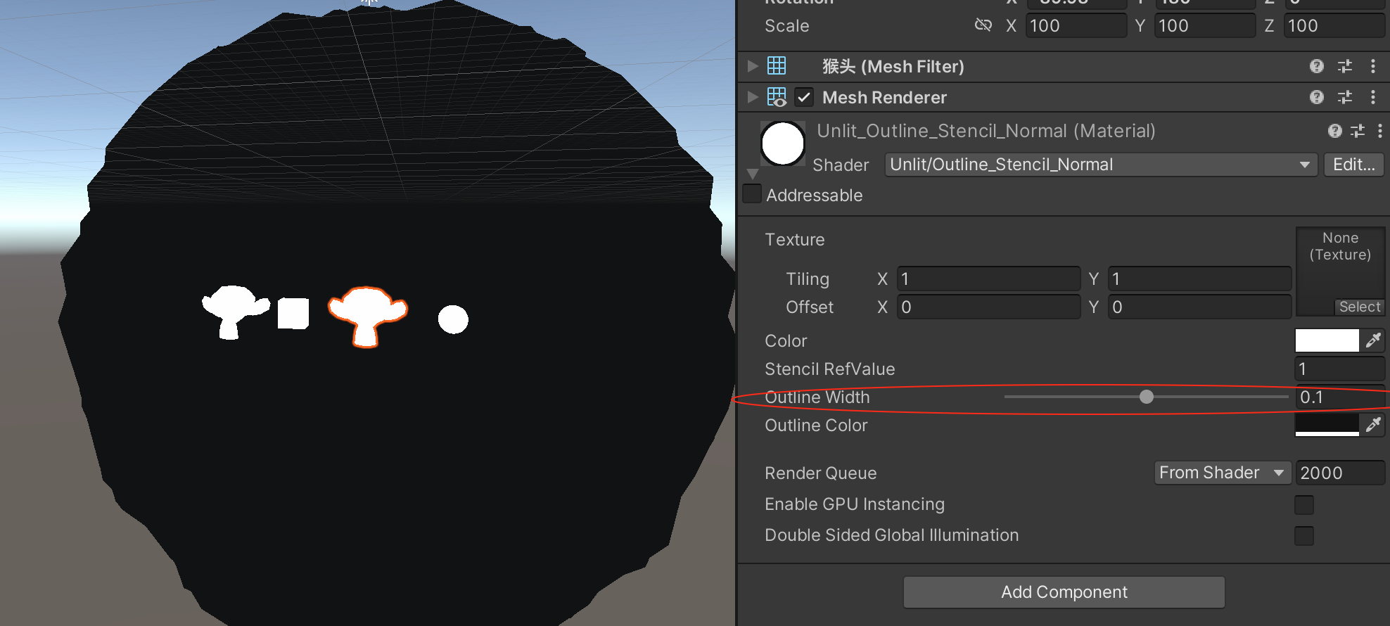 注意这里将第二个Scale 为100 的猴头取消显示,是因为在下面的Shader 实现下相同的描边设置下,因为Scale 问题,它的描边也放到了100 倍,如下:
