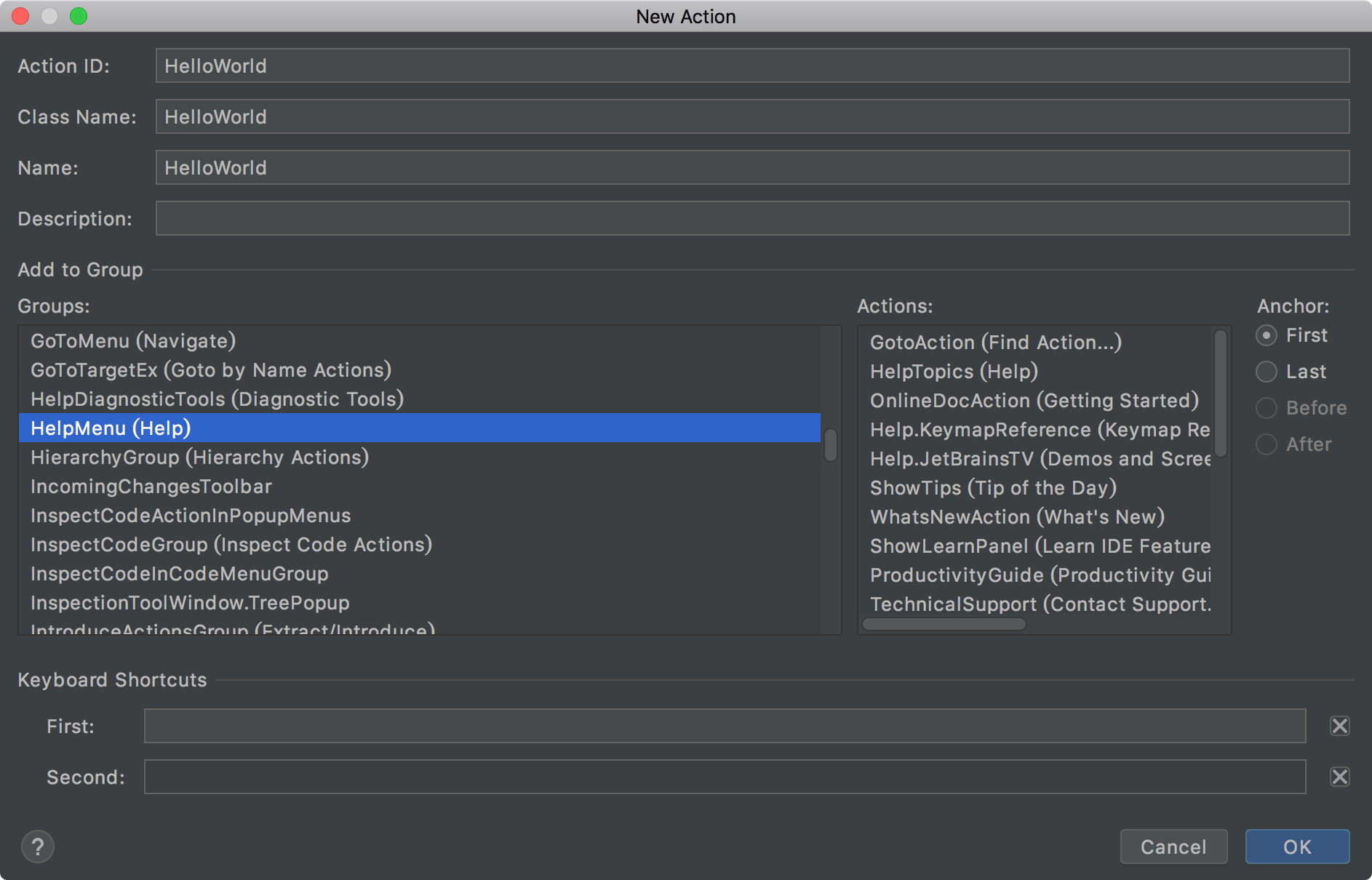 Action ID 保证不重复即可,选择HelpMenu(Help)表示这个Action 在Help 菜单的里面