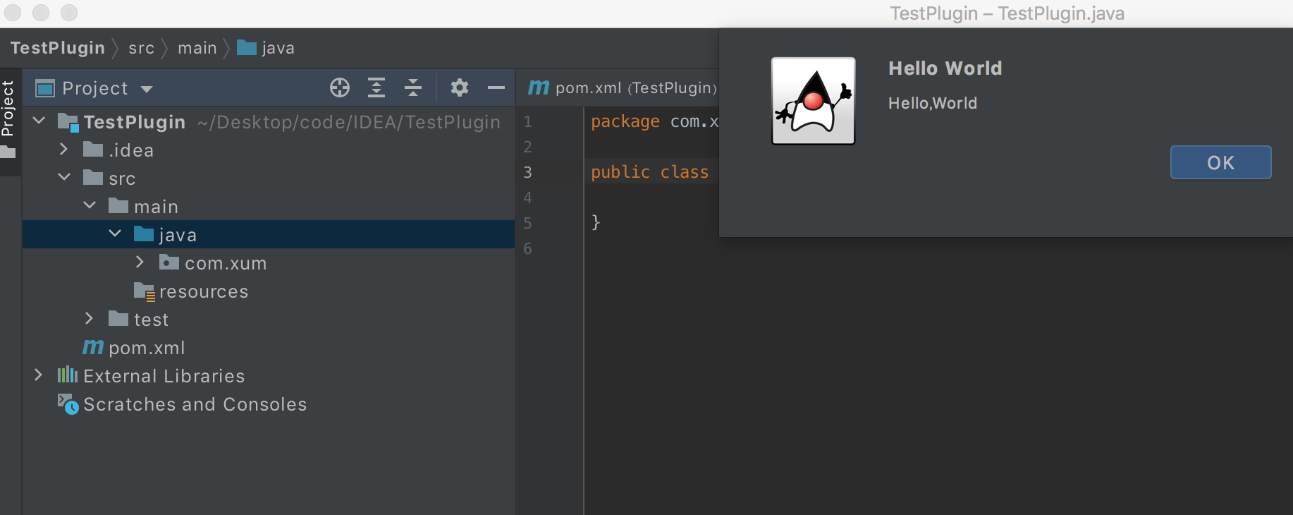 运行之后会打开一个新的IDEA 程序,比如创建一个Meaven 项目,并且新增一个Java文件,然后在【Help】菜单下面可以看到有一个【Hello World】的选项。点击后可以看到下面的弹出框