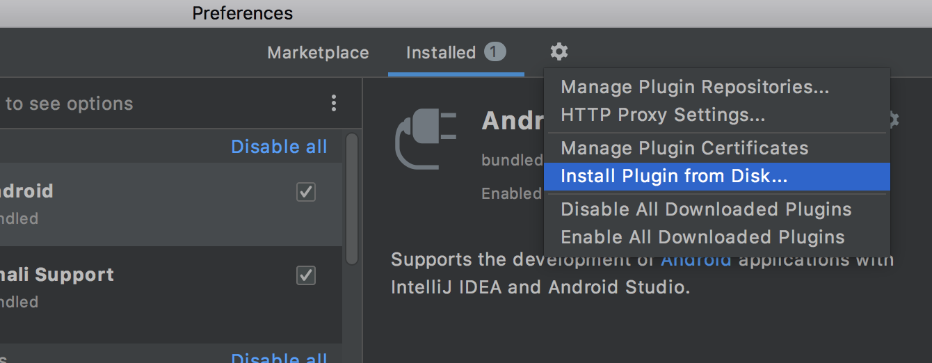 【File】->【Settings…】->【Plugins】,在这里可以指定通过刚才打包得到的jar 进行安装
