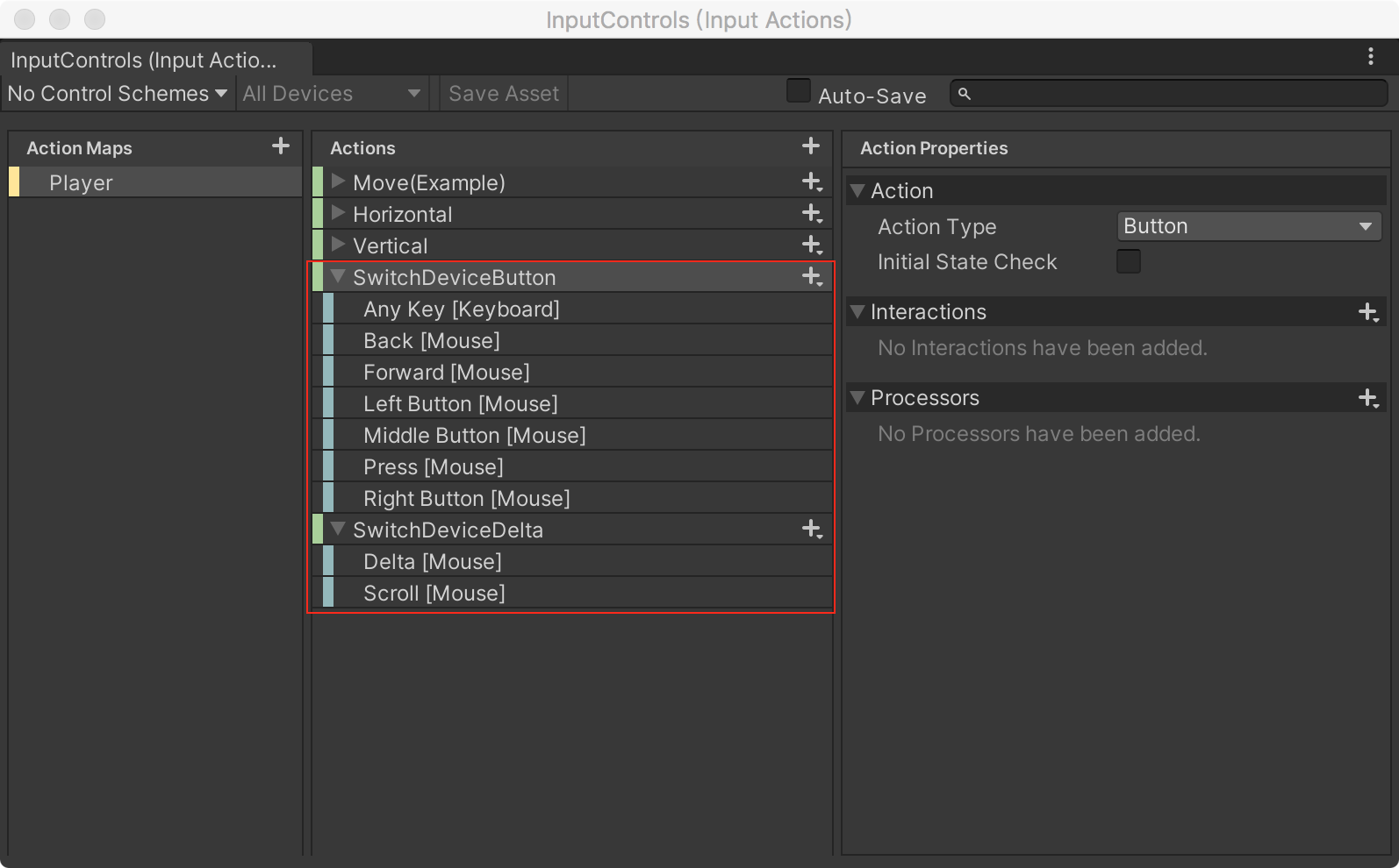 第二个问题还好,只是触发多次回调,我们做好设备检查的逻辑就好,怎么解决第一个问题?粗暴一些,直接在Player Input 中绑定所有设备的所有操作(键盘按键、鼠标按键、鼠标滚动……),其他设置都不需要。如下图的设置只支持键盘按键、鼠标按键、鼠标滑动触发的切换,其他比如手柄暂不支持,如果需要支持,则对应在这里添加即可!