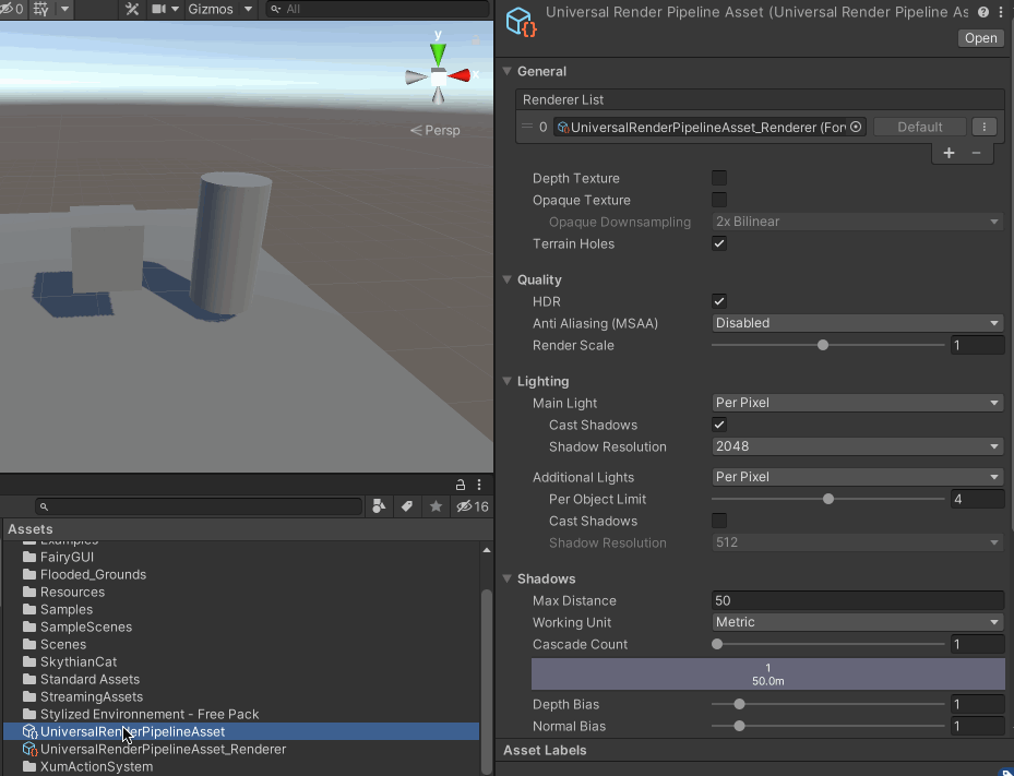 - Material:渲染对象时,Unity会使用该材质替换分配给它的材质