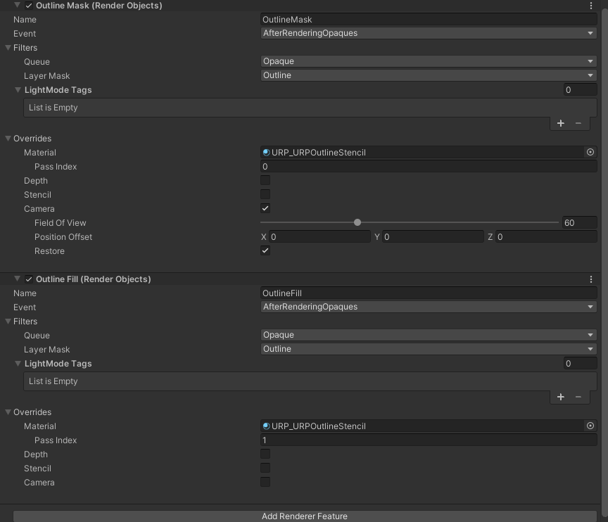 基于上面的Shader 创建材质球,然后AddRenderFeature,增加两个RenderObject。第一个为OutlineMask,指定Pass Index 为0,来处理mask;第二个指定Pass Index 为1,用来法线外扩填充描边