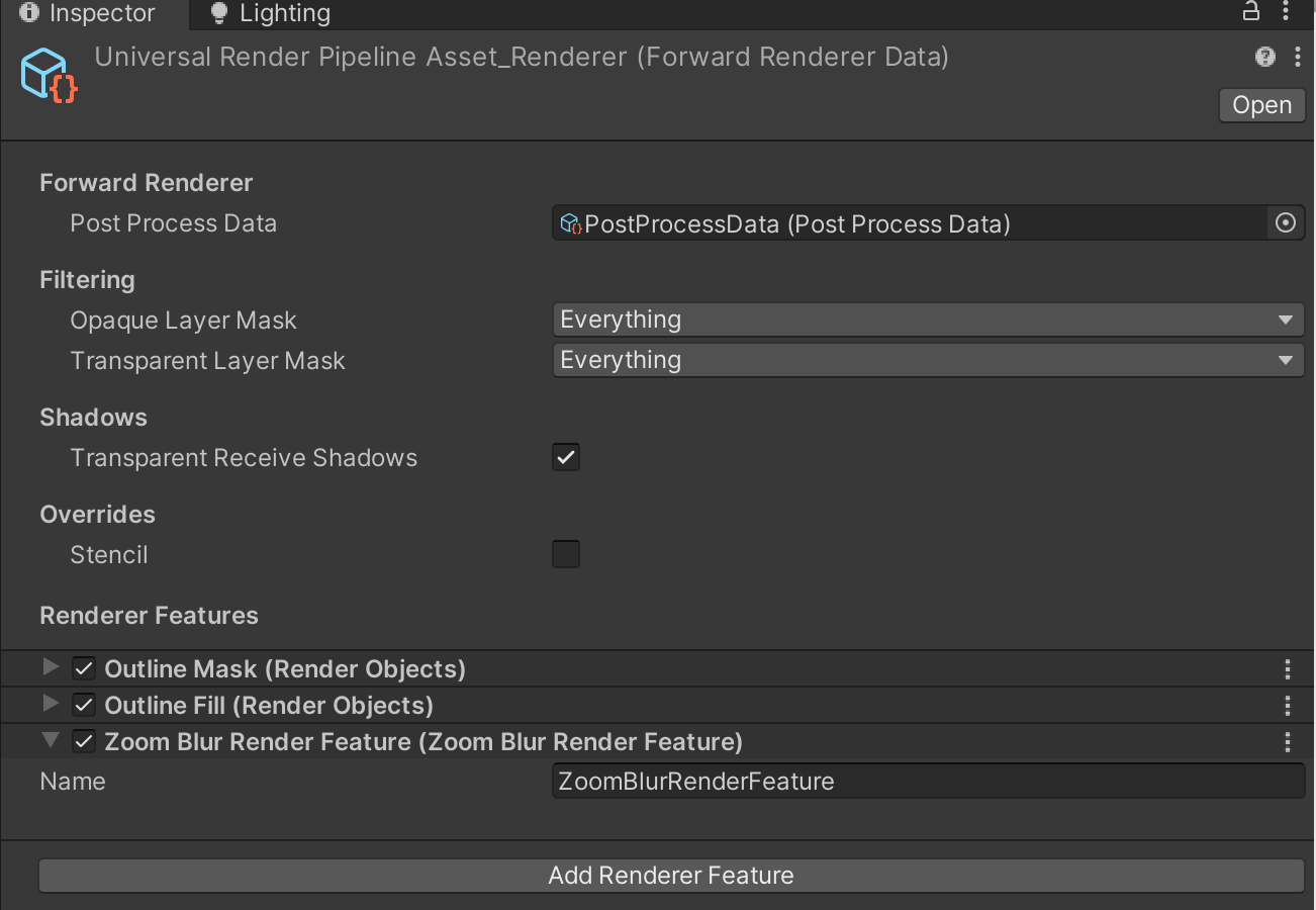 在UniversalRenderPipelineAsset_Renderer 中Add Render Feature,增加ZoomBlurRenderFeature