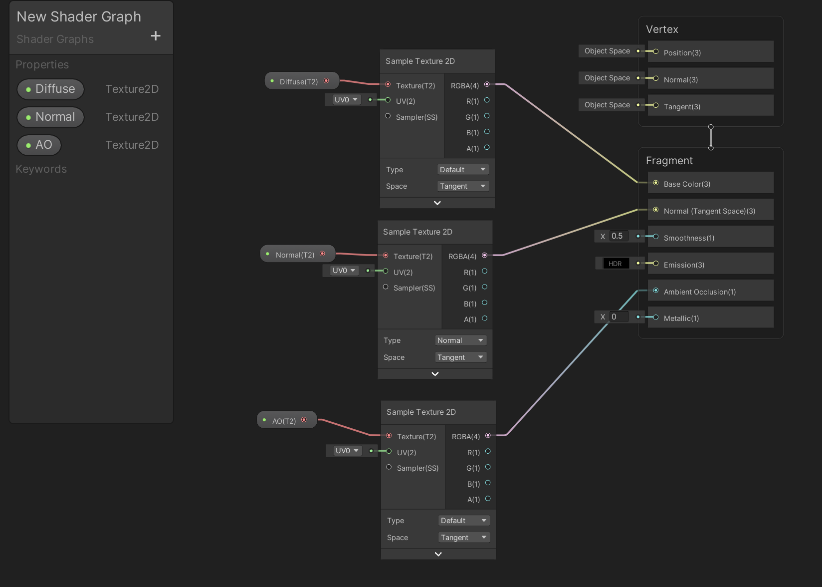 Texture2D 属性连接到Sample Texture 2D,Sample Texture 2D 再连接到Fragment 的相应属性,比如这里分别连了Base Color、Normal、Ambient Occlusion