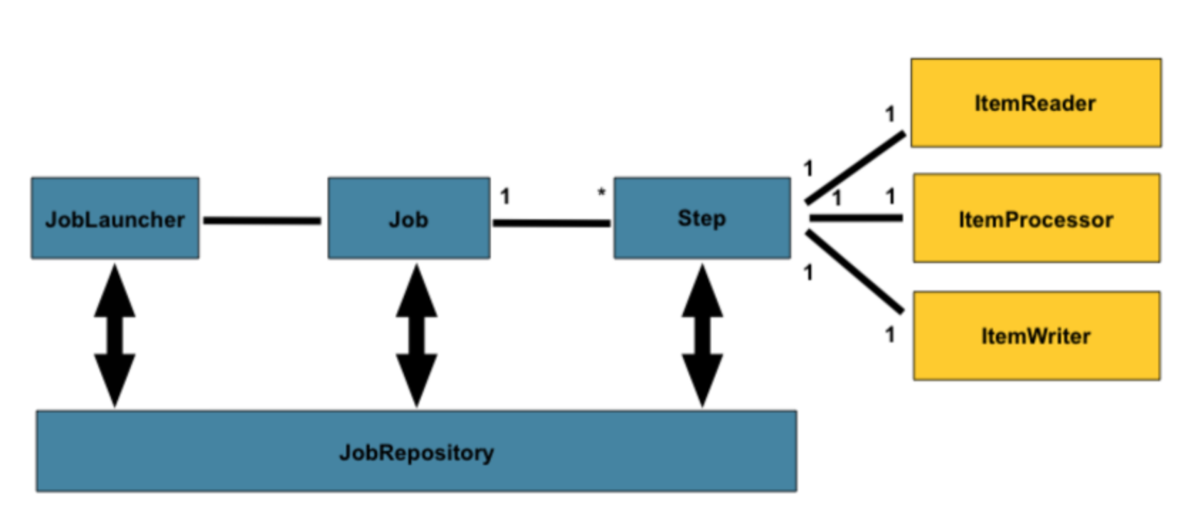 - Step 代表一个具体的步骤,一个Job 可包含多个Step。读取、处理、输出