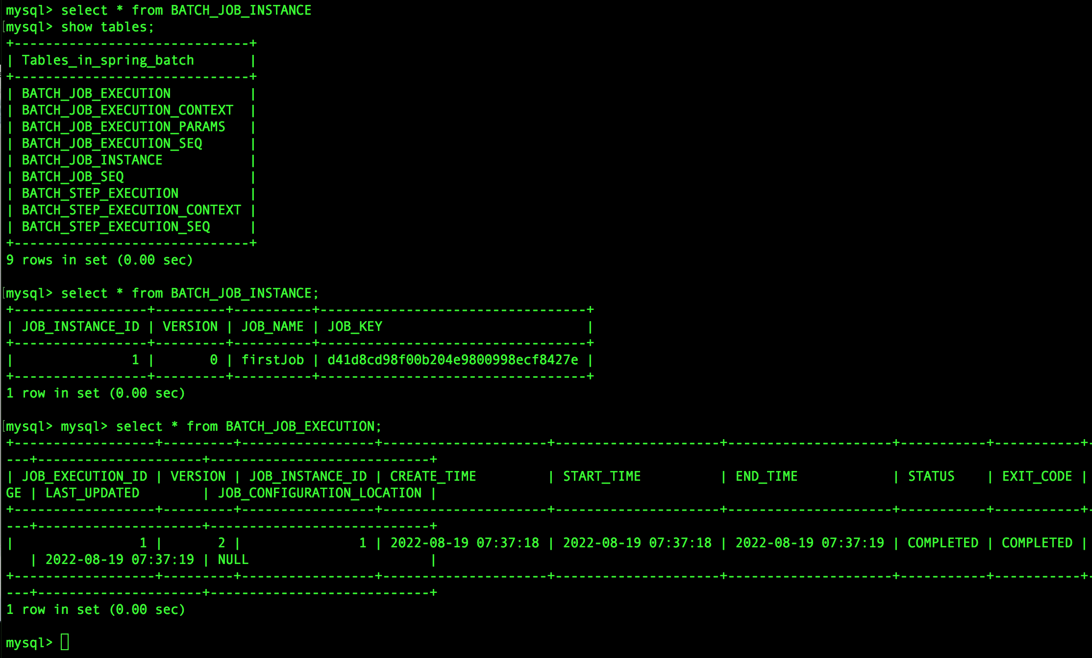 - Job 的每次执行对应batch_job_execution 中的一个记录