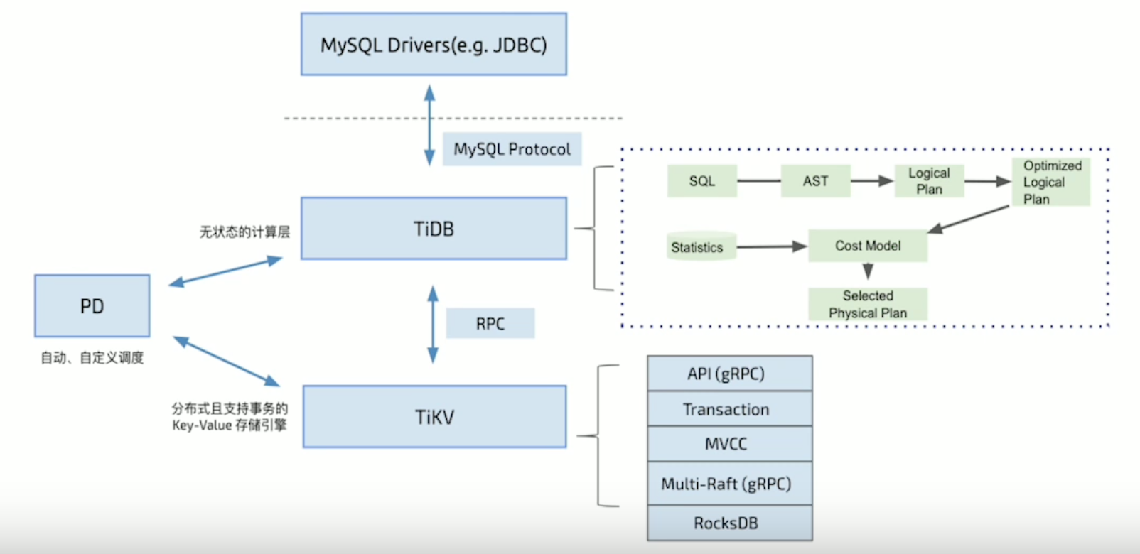 第二层是分布式存储引擎TiKV,TiDB-Server 本身并不存储数据,只是进行计算,实际的数据存储在存储层,即TiKV