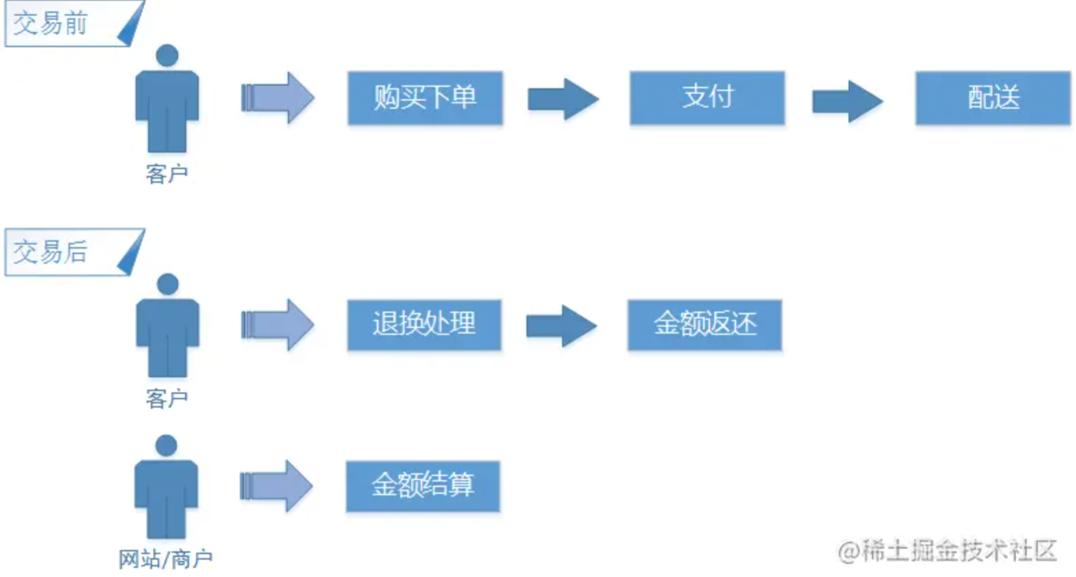 交易前:客户购买下单,支付金额,电商网站确认支付后进行配送发货;交易后:在退换周期内,客户申请退换,电商进行退换处理,并返还客户金额,同时对交易金额进行结算