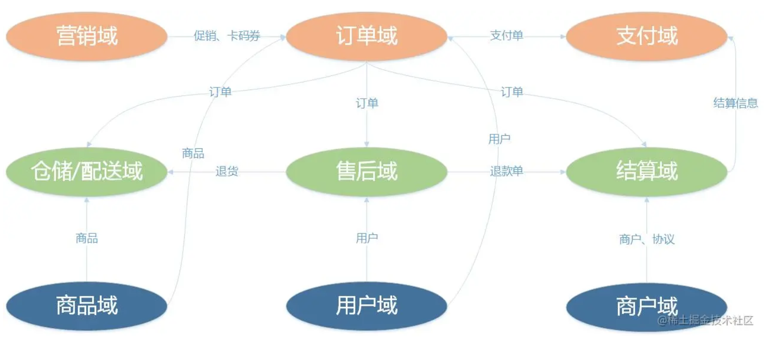 交易系统包含的内容太多繁杂,很难对系统的全貌直接描述,所以需要对其进行分解,将交易过程中涉及的业务问题划分到不同的业务子域中。如:用户的登录/注册(用户域),网站上展示商品的管理(商品域),商品购买后的支付(支付域)等。让复杂的交易问题渐逐步分解,让子域聚焦本域内的问题解决