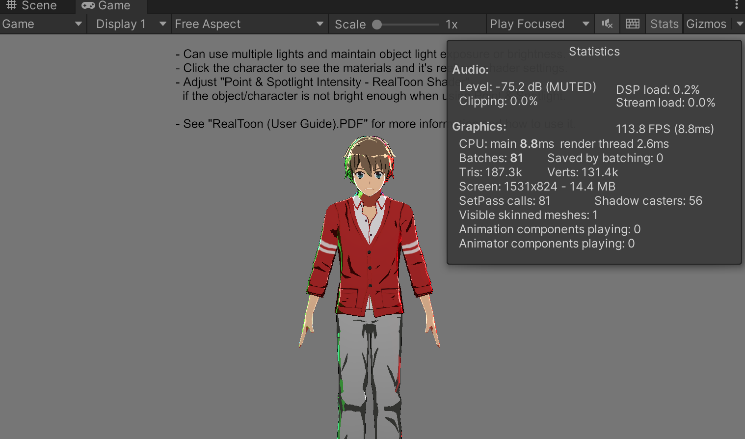 然后可以导入/Assets/RealToon/RealToon Examples/Built-In RP [3D]/RealToon Built-In RP [3D] (Example).unitypackage,就可以看到官方的演示效果!