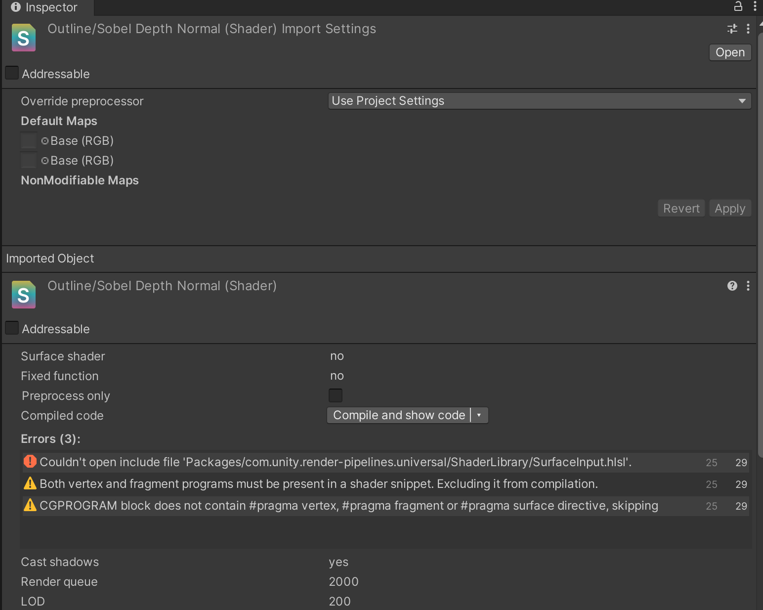 找到Render Feature 对应的材质,然后再找到对应的Shader,果然有报错,如下所示