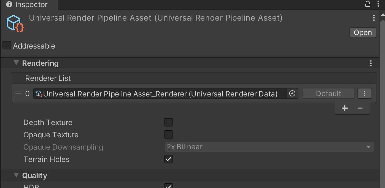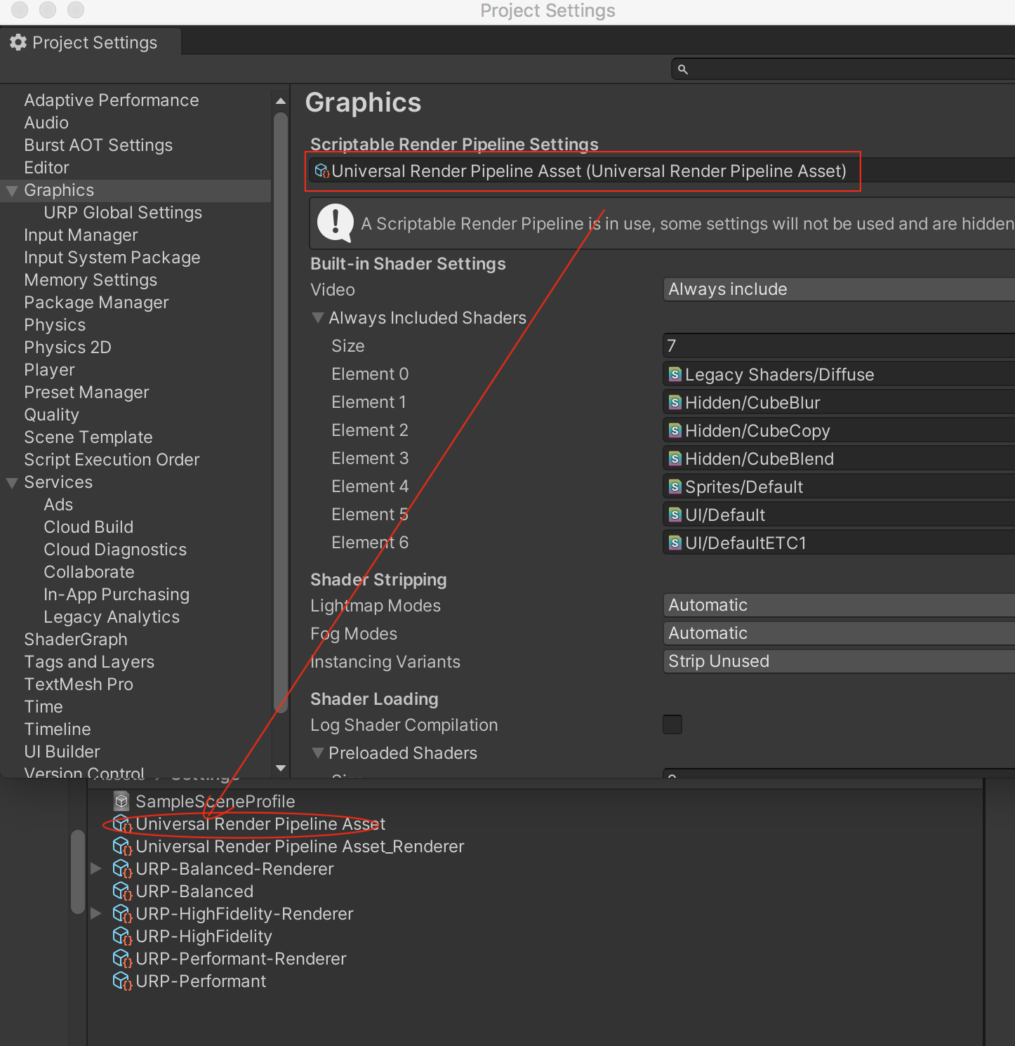 在【Project Settings】->【Graphics】 下面的Scriptable Render Pipeline Settings 找到Universal Render Pipeline Asset.asset