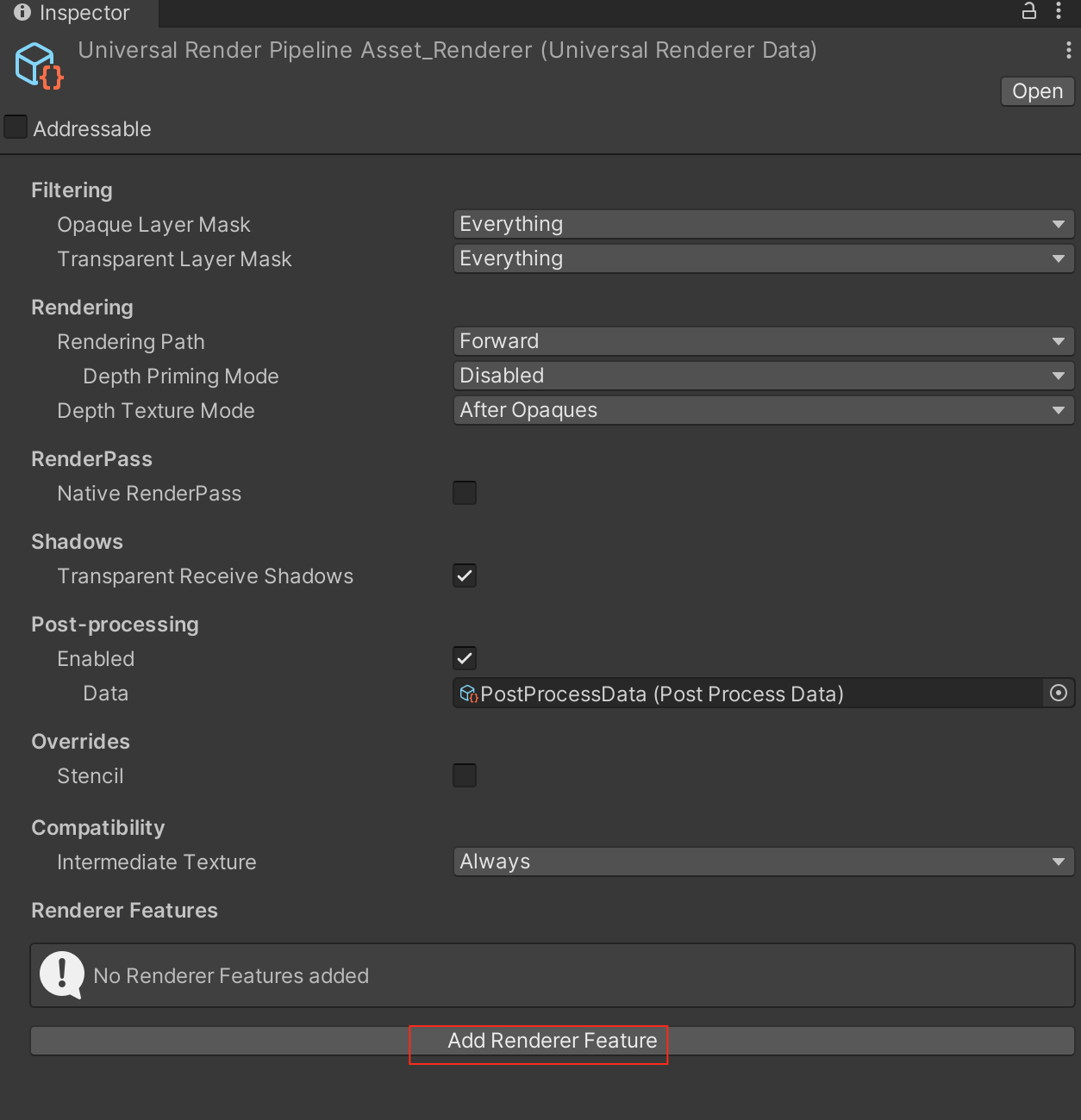 在Universal Render Pipeline Asset.asset 的Renderer List,找到Universal Render Pipeline Asset_Renderer.asset,当然可以在这里再添加一个Render 资产